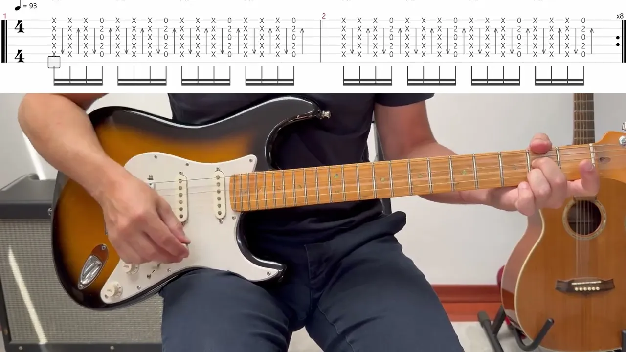 Colpisci solo il terzo sedicesimo (“&”) con downstroke. Backing track 93 BPM. Sincope controllata senza bloccare la mano.